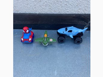 Leksaksbilar: Spiderman, Transformers flygplan och Monster Jam hajtruck