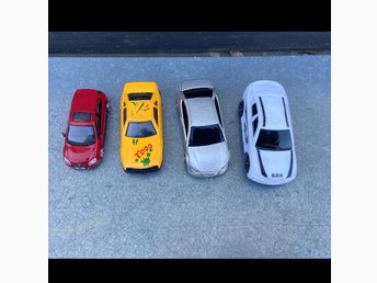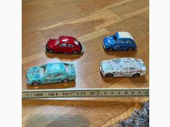 Fyra leksaksbilar i metall och plast