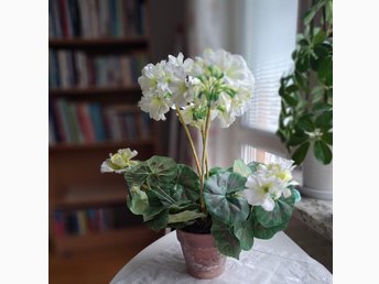 Konstgjord pelargon i kruka. Pelargoner, konstgjorda blommor, dekorationer.
