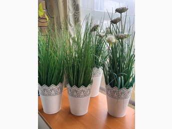 4 konstgjorda växter i vita krukor