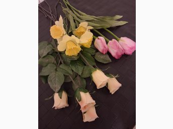 Konstgjorda blommor: Rosor, tulpaner och påskliljor
