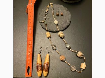 Örhängen i trä och handgjort halsband i sten och glaspärlor.