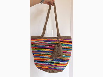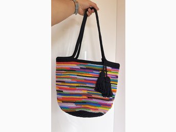 Färgglad handvirkad väska med svarta detaljer & tofsar – UNIK DESIGN