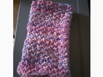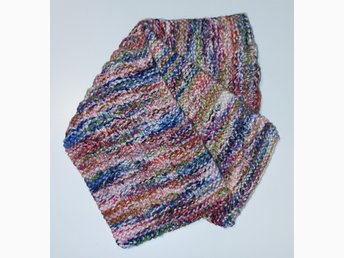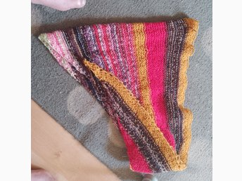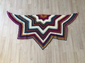 Multifärgad sjal stickad i ull med virkad kant upptill