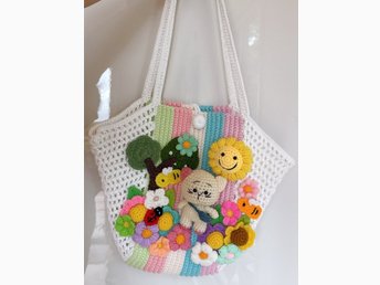 Handgjord virkad väska med söt hund och pastellregnbåge – UNIK & FÄRGGLAD