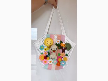 Handgjord virkad väska med kattunge & pastellblommor – UNIK
