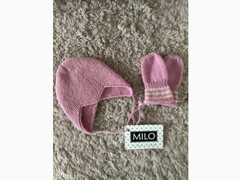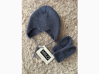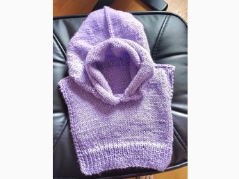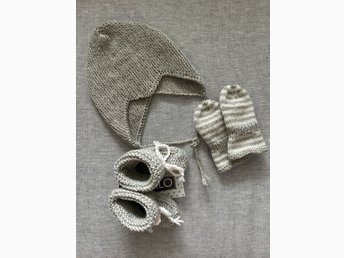 Babyhjälm och vantar st ca 3månader. Handstickade.