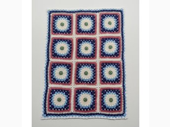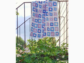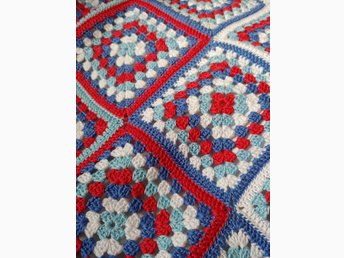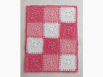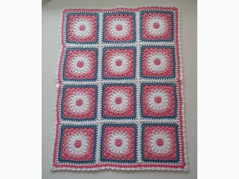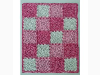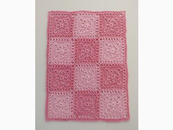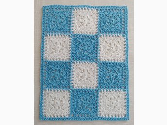 Virkad barnfilt, ca 75 x 99 cm, bomull, mormorsrutor, dopgåva, babyshower