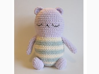Virkad nalle i velvet/sammetsgarn handgjord present pastell