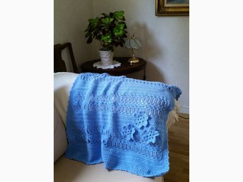 Ny virkad BABYFILT i blått, ca 88 x 72 cm.
