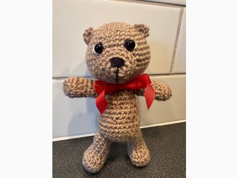 Söt Handgjord virkad Teddybjörn med rött band