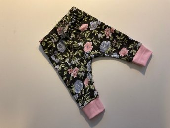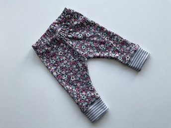 Handgjorda blommiga trikåbyxor/leggings till baby, med benmudd, storlek 56