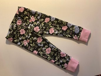Handgjorda blommiga trikåbyxor/leggings till barn, med rosa benmudd, storlek 80
