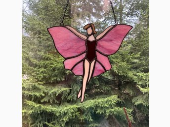 Tiffany-teknik glaskonst hantverk rosa älva +/- H17 B19 cm flygande älva