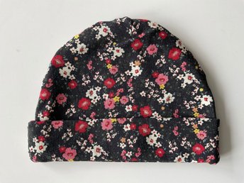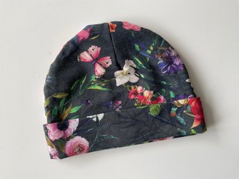 Handgjord blommig mössa till baby i bomullstrikå, storlek 36/38