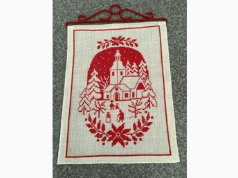 Jättefin Handbroderad Väggbonad Med upphängningsbeslag i röd metall Motiv kyrka