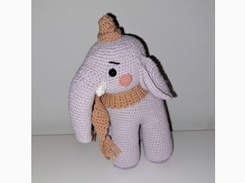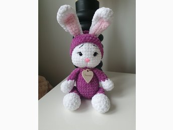 Handgjord virkad kanin i lila och vitt pyjamas