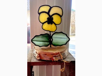 färgad glaskonst Tiffany teknik gul viol på en björkskiva +/- H 12 B10 cm