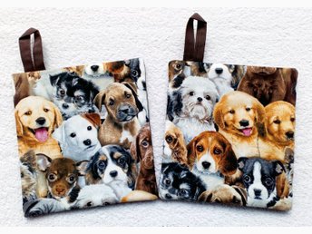 Hundporträtter. Grytlappar. Handgjorda, välsydda, stora. Designtyg. Bra kvalitet