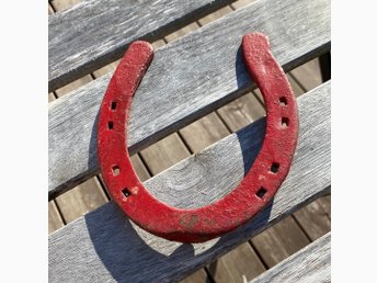 Hästsko järn gjutjärn rejäl målad faluröd dekoration trädgård stuga sommar