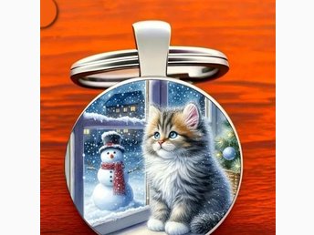 En nyckelring i metall och glas med en söt liten katt och snögubbe! Vinter.