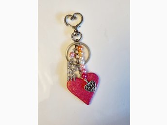 Bag charm väskhänge/nyckelring med rosaglitter hjärta och berlocker