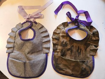 Två läckra haklappar för lillen, hemsytt, kamoflage, haklapp, dopgåva, bebis