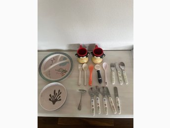 Barnservis med tallrikar, muggar och bestick