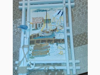 Broderad Tavla med Segelbåtar i Ram med Ankare fiskar och fiskmås i trä