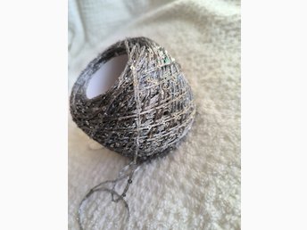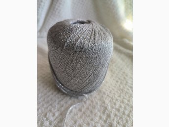 Glittrande garn med 70 % bamboo, 30% syntetfiber/rayon, ljusgrå/silver.