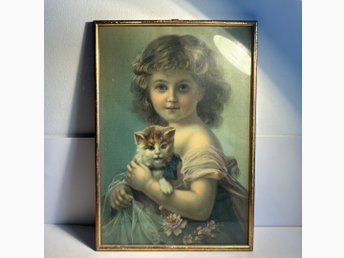 Fint gammalt Tryck - Flicka med KATTUNGE