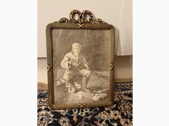 Antik tavla med jägarmotiv – guldram, ca 30x18 cm