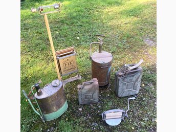 Diverse Äldre vintage Föremål bla Våg, brandspruta i koppar, ogrässpruta mm