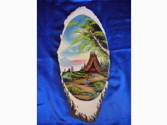 Gammal målad tavla med samer / lappar. Tält, båt. fjäll. Sameslöjd