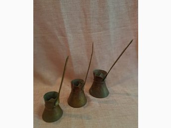 3 st antika mokkakannor i koppar – orientaliska miniatyrkärl med kronkant