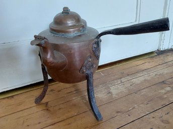Antik el. Semi-antik kanna i koppar med fötter och lock-handtag i mässing