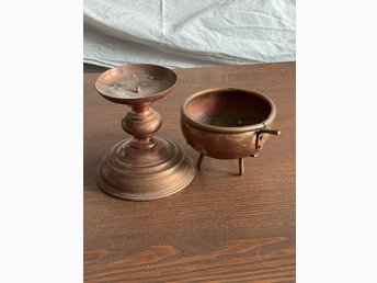 2 ÄLDRE I KOPPAR. LJUSHÅLLARE H 11CM. BUNKE H:7,5 CM