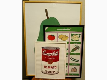 Tre Tavlor med tema Mat. Inramade affischer. Bl.a. Andy Warhol.