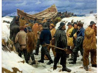 LIVBÅTEN DRIVS GENOM SANDDYNERNA 1883 av ANCHER Fiskargubben Skagen Danmark DUK