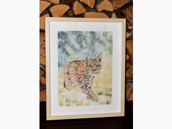 Lodjur i snöfall - Inramad Oljepastell Tavla av Jan Vogo