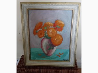 Vintage:Ringblommor, olja på pannå sign B Lööf
