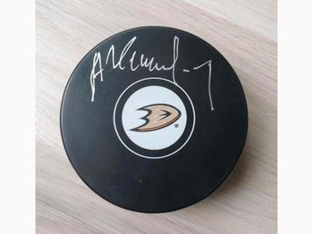 Ishockeypuck signerad Alexej Kasatonov Anaheim Ducks, tillverkad i Slovakien