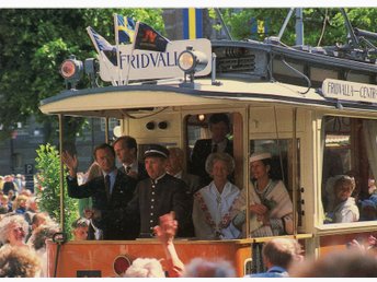 Vykort, kungen och drottningen åker spårvagn i Norrköping 1989
