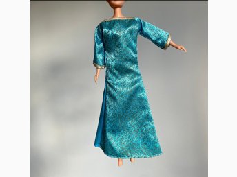 Barbieklänning i blå satin med mönster