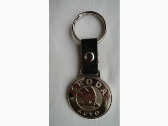 SKODA AUTO nyckelring i metall och läder i fint skick diameter 35 mm