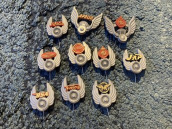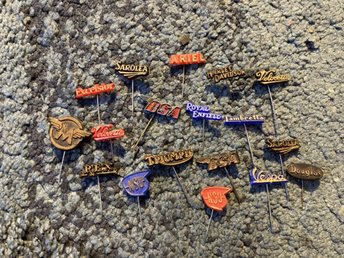 Parti diverse vintage nålmärken i plast, reklam för olika motorcykelmärken