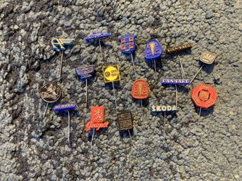 Parti diverse vintage nålmärken i plast, reklam för olika bilmärken mm