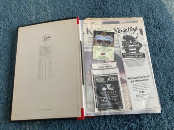 Pärm med biljett och diverse tidningsklipp om Michael Jackson