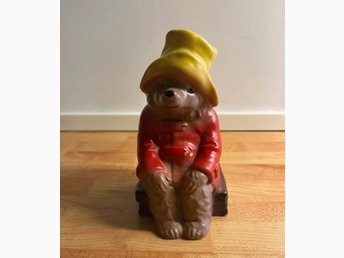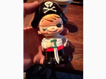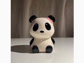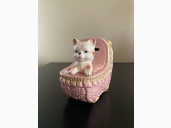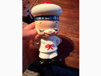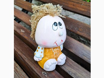 Vintage spargris i keramik som kallas "Love Me Doll Coin Bank".
