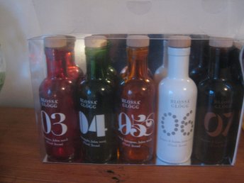 5 st små Blossa Glögg flaskor år 2003-2007 med recepthäfte samlare nyskick